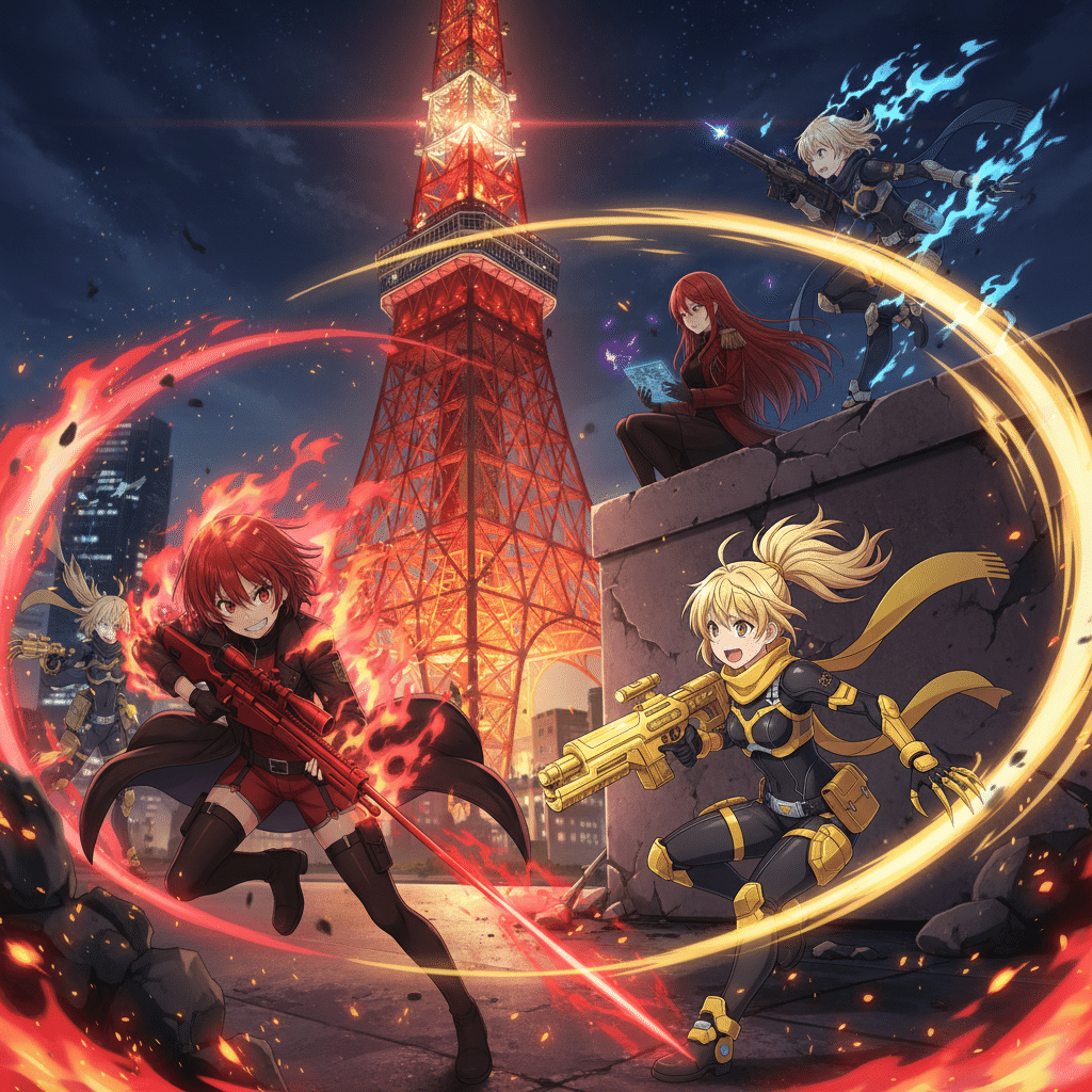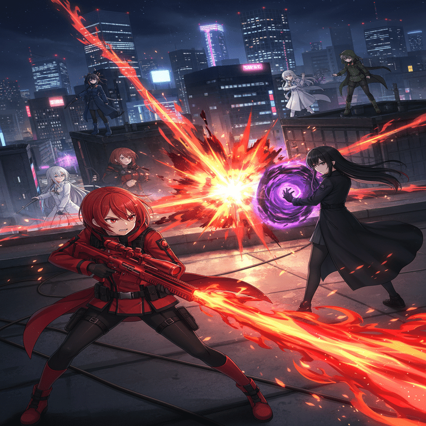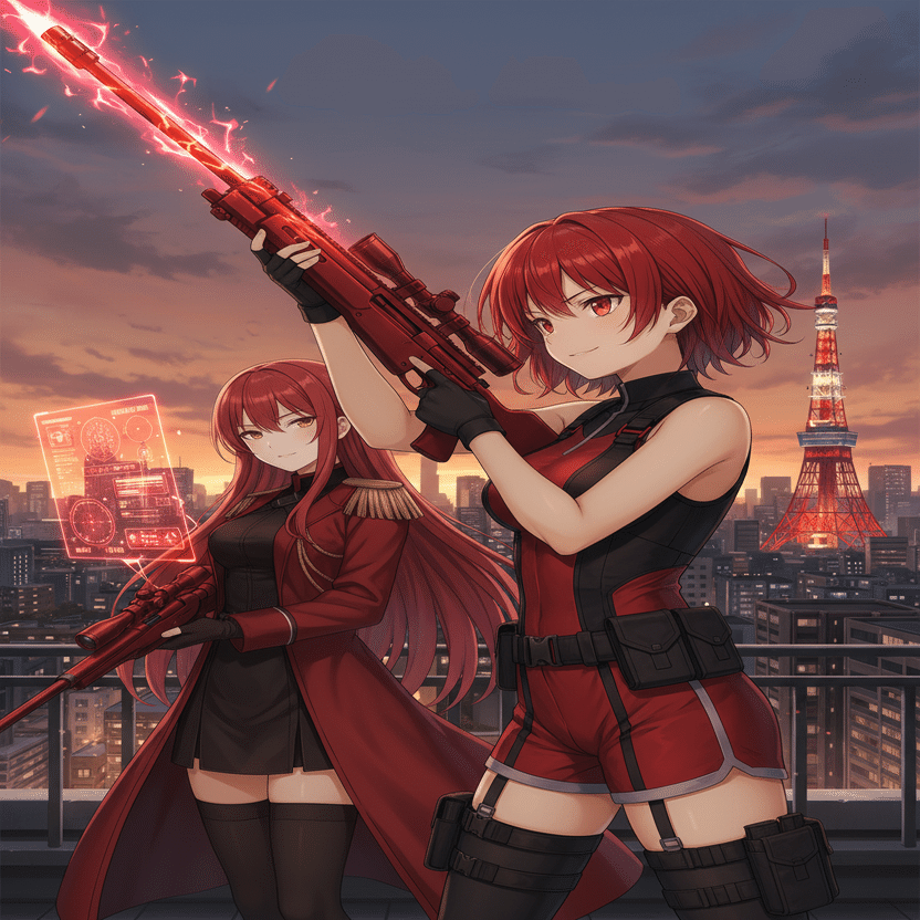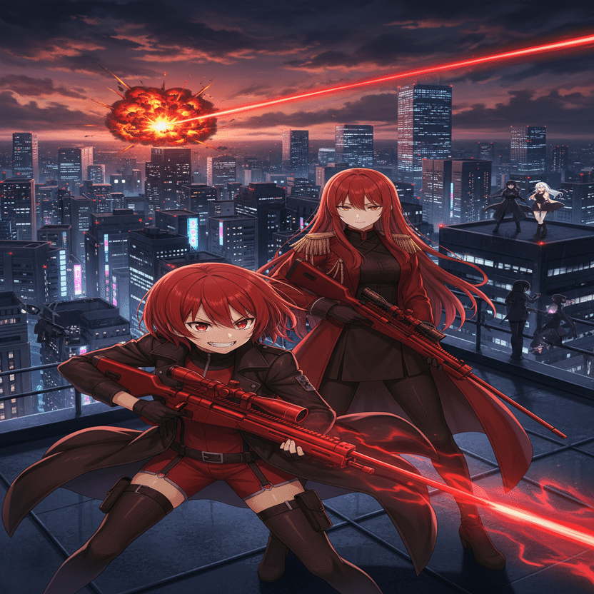 希は、予測弾道計算を瞬時に完了させた。彼女の『精密射撃』の能力は、相手の移動パターンすら計算に組み込む。ターゲットが次に姿を現すのは…、西側から三番目のビル、通信アンテナの影。計算結果は、一点を指し示していた。『シルバーランス』の銃口が、静かにその一点へと移動する。しかし、その瞬間、予期せぬ事態が発生した。ビル群の谷間を縫うように、まるで血のような紅蓮の光が走った。「なっ…!」希は思わず声を上げた。紅い弾道は、クレーン跡地から西側のビルへ移動する途中の『影』、黒崎夜音のわずか数メートル手前の壁を抉り、火花を散らした。同時に、夜音たちとは反対側の、南東方向の巨大ビル群から、鋼鉄の弾丸が放たれた音(音速を超えていない低音)が遅れて響き渡る。夜音の『影』が、一瞬、戸惑ったように停止した。希の視線が、紅い閃光の発生源、南東方向へと向かう。そこには、赤と黒の、鮮烈なコントラストを纏った二人の少女が立っていた。『赤』チーム。緋村茜(ヒムラ・アカネ)と赤坂椿(アカサカ・ツバキ)。「緋村茜…!」莉々花が唸った。緋村茜は、夜空の下で炎のように鮮やかな赤いライフルを構え、獰猛な笑みを浮かべていた。「おっと、純白の女王様たち、今宵は『黒』の狩りの時間だろ? 獲物は横取りさせてもらうぜ!」茜の挑発的な声が、風に乗って微かに届く。一瞬にして、戦闘の局面は『白vs黒』から、『白vs黒vs赤』の三つ巴へと変貌した。希は冷静に状況を判断した。「ターゲット変更。夜音、闇音。そして…緋村茜、赤坂椿。どちらも、この戦場にいる限りは敵」希の瞳が、冷たい決意を宿して輝いた。「莉々花、作戦を修正する。『純白の裁き』は、まず、この戦場の統制を取り戻すことから始めるわ」新宿の夜空の下、『クロスカラーウォーズ』、東京ラウンドの火蓋は、三色の衝突によって切って落とされた。