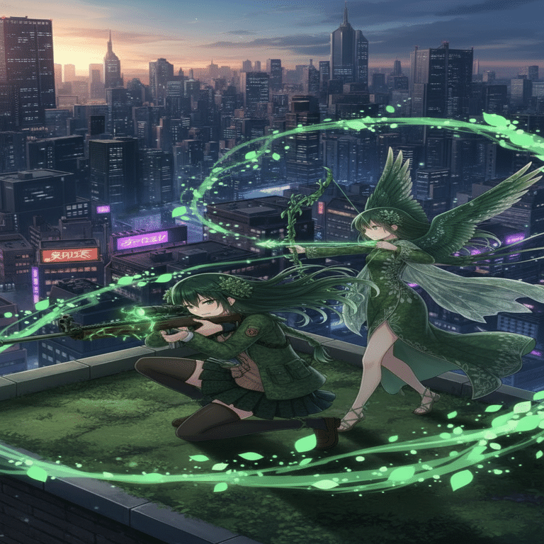 緑チーム: 緑川葉月&風葉芹歌 – 「森の囁き、風の調べ、確実に仕留める」『緑』チーム。緑川葉月(ミドリカワ・ハヅキ)と風葉芹歌(カザハ・セリカ)。葉月は、腰まで届く長い緑の髪を風になびかせ、冷徹な瞳で戦場全体を見渡していた。その手には、植物の蔓を模したような有機的なフォフルライフル『フォレストウィスパー』。隣に立つ芹歌は、小鳥のように可憐な容姿とは裏腹に、強い意志を秘めた表情で、特殊な弓を構えていた。彼女の身体からは、まるで生命力が溢れるかのように、微かに緑色の光が揺らめいている。「風の調べ…そして森の囁き…」希の視線が、警戒の色を帯びた。「緑チーム。彼女たちも、この戦いに参入した」葉月が、まるで都市のビル群と一体化するように、『ナチュラルカモフラージュ』の能力を発動させた。その姿は、一瞬にして背景に溶け込み、視認することが困難になる。そして、芹歌は弓を引き絞り、緑色の光を放つ矢を夜音と闇音に向けて放った。『フローラルウィスパー』!矢は、夜音たちが立つビルの壁に突き刺さると、瞬く間に大量の蔦と花を咲かせ、彼らの退路を塞ぎにかかった。「ちっ…面倒な連中が、また増えたな」夜音が舌打ちした。戦場は混沌の度合いを深めていく。白、黒、赤、緑。四色の思惑が、新宿の夜空の下で複雑に絡み合い、激化していく。希は、再び『シルバーランス』を構え直した。「莉々花、気を緩めないで。この戦場は、もはや私たちの予測の範囲を超えつつある。しかし…『純白の裁き』は、何者にも邪魔させない」
