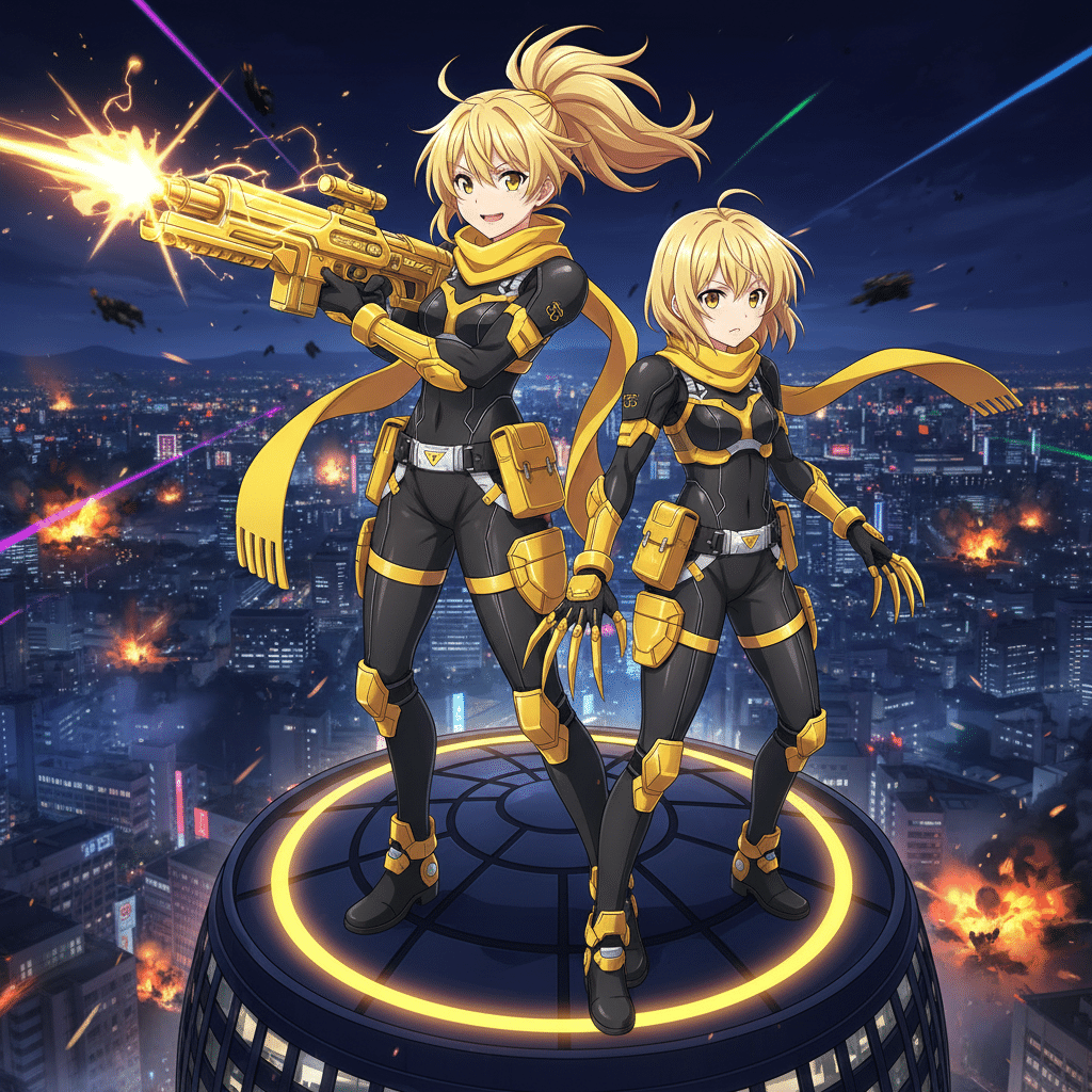 場所: 東京、新宿。高層ビルの屋上、廃墟の建設現場、そして夜空。時間: 零時を告げた直後から激戦の数分後。新宿の夜は、七色の光と影が織りなす壮絶な戦場と化していた。白石希と莉々花の白。黒崎夜音と影月闇音の黒。緋村茜と赤坂椿の赤。緑川葉月と風葉芹歌の緑。天海葵と蒼井凛の青。そして、村崎菫と紫蝶魅音の紫。それぞれの思惑が激しくぶつかり合い、誰もが優位に立てない混沌とした状況が続いていた。葵は、破損したライフルを片手に、迫り来る夜音と茜の攻撃を凛の援護と共に捌いていた。魅音の『ポイズンウェブ』が地面を覆い、逃走経路を制限する。葉月の『ナチュラルカモフラージュ』は依然として脅威であり、どこから狙撃が飛んでくるか分からない。「この状況、誰かが動かないと膠着状態ね…」希は、莉々花と共に警戒態勢を取りながら、戦場全体を見渡していた。その時、一筋の閃光が、新宿の夜空を切り裂いた。ピカッ!それは、太陽が昇ったかのような、強烈な光だった。一瞬にして、戦場にいる全ての狙撃手の視界を奪う。「ま、眩しい!?」莉々花が目を覆う。「なんだ、この光は!?」茜が叫んだ。夜音も、闇音も、葵も、菫も、葉月も、皆がその突然の閃光に身動きを止めた。その光が収まった瞬間、東京モード学園コクーンタワーの最上部、巨大な球体型のオブジェの上に、二人の少女が立っていた。鮮やかな黄色を纏った、双子の姉妹。