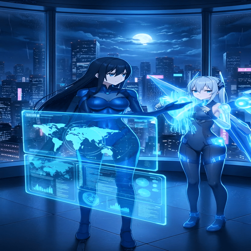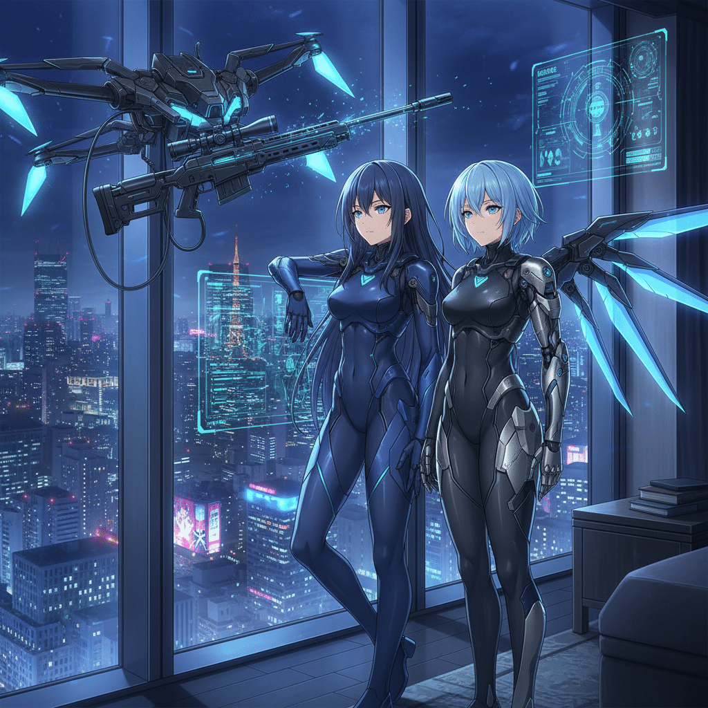 都内の高層ビル最上階、豪華なペントハウス。天海葵は、損傷した『アクアストライカー』を専門のメンテナンスドローンに預け、ガラス張りの窓から新宿の夜景を見下ろしていた。隣には、ボディにわずかな傷を負った蒼井凛が、無言で立つ。「…まさか、闇音に不意を突かれるとはね。通信ユニットを破壊されるとは、私の『ブルースキャン』もまだ完璧ではないか」葵は、自嘲気味に呟いた。「マスターの予測は、常に99パーセントの正確さです」凛が、機械的な声で答える。「残りの1パーセントを埋めるのが、私の役割です」葵は、ふと、緋村茜の顔を思い出した。かつての親友。「茜…あの熱血漢は、相変わらずね。私の獲物を横取りされたと怒り狂っていた」凛はデータに基づいて情報を提示した。「緋村茜は、マスターにとって友情決裂の因縁。しかし、データ上では協力関係を築く可能性も0.03パーセント存在します」「0.03パーセント?ほとんどゼロじゃない」葵は苦笑した。彼女の脳裏には、過去の茜との思い出が蘇る。共に訓練に励み、語り合った日々。だが、今はもう、全てが壊れてしまった。「静寂を裂く一閃…」彼女たちのテーマは、静かで冷徹な一撃。しかし、その心の中には、かつての友情への複雑な感情が渦巻いていた。「最終フェーズの準備を始めなさい、凛」葵は、再び冷徹な表情に戻った。「次は、いかなる予測不能な事態にも対応できるよう、万全を期すわ」『静寂を裂く一閃』。彼らの一撃は、次の舞台で、何を切り裂き、何を明らかにするのか。紫チームの隠れ家