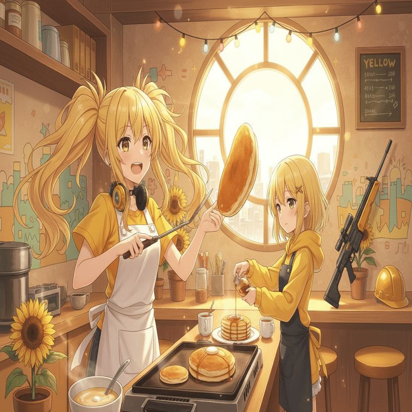 黄チームの隠れ家新宿の繁華街にある、カラフルな隠れ家カフェ。向日葵ひまわりと柚葵は、キッチンで朝食の準備をしていた。パンケーキの甘い香りが、店内に広がる。「うわー、朝からパンケーキ!最高だね、柚葵!」ひまわりは、元気いっぱいの笑顔で、パンケーキをひっくり返す。「うん…でも、ひまわり姉ちゃん。今日の戦いも、なんだか難しそうだね」柚葵は、少し心配そうに言った。ひまわりは、柚葵の顔を覗き込んだ。「大丈夫だよ、柚葵!難しいことなんて、私たちがぶっ飛ばしてやればいいんだよ!私たちは、『閃光の如く、標的を捉える』!自由に、思いっきりやるだけ!」彼女たちの心には、組織の陰謀や因縁といった重苦しい感情はなかった。ただ、この「クロスカラーウォーズ」を、自分たちらしく楽しむことだけを考えていた。「白の統制を揺さぶる『自由』の象徴…か」ひまわりは、ふと、白石希の顔を思い出した。「あの真面目そうな白い子たちも、もっと自由に楽しめばいいのにね!」『閃光の如く、標的を捉える』。彼らの自由な閃光は、次の舞台で、何者を照らし、何者を突き動かすのか。夜が明け、東京の街に新たな一日が訪れる。しかし、「クロスカラーウォーズ」の参加者たちにとっては、それは新たな戦いへの準備期間の終わりを告げるものだった。それぞれの思惑、それぞれの因縁。謎の組織の陰謀は、深まりを見せ、七色の少女たちは、次の舞台へと向かっていく。