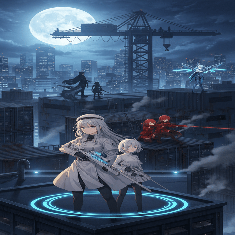 東京湾埠頭の倉庫街。夜の闇に沈む巨大な倉庫群と、積み重なるコンテナの合間から、各色の狙撃手たちが静かに姿を現し、それぞれのポジションへと移動していく様子。月明かりが倉庫の屋根を照らし、緊張感が高まる。場所: 東京湾埠頭の倉庫街。時間: 深夜0時を過ぎた頃。東京湾埠頭の夜は、潮の香りと錆びた金属の匂いが混じり合い、不穏な静けさに包まれていた。深夜0時を過ぎ、七色の狙撃手たちはそれぞれの獲物を求め、迷路のような倉庫街へと潜入していた。