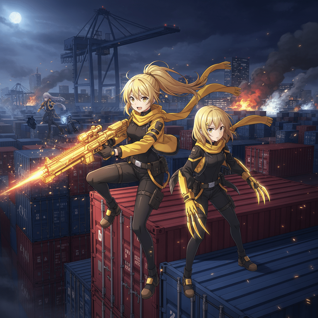 高台の倉庫屋上白石希は、高台の倉庫屋上から『シルバーランス』を構え、広範囲を『シルバーマーク』でスキャンしていた。莉々花は、緊張した面持ちで周囲を警戒している。「莉々花、ターゲットは埠頭の東側、コンテナの影に潜む『赤』チーム。そして、埠頭の西側、巨大クレーン頂上に展開している『青』チームよ」希は冷静に指示を出す。「私たちの目標は、この二つの火種を消し、戦場を統制すること」その時、希の『シルバーマーク』が、新たな熱源を捉えた。埠頭の北側、最も入り組んだ倉庫群の影。それは、黒崎夜音と影月闇音の『黒』チームの反応だった。「黒も動き始めたわね…予想通りよ」希の瞳に、わずかな感情の揺らぎが見えた。希は、照準をコンテナの影に潜む『赤』チームへと合わせた。『純白の裁き、逃れられない』。その言葉が、彼女の心に響く。