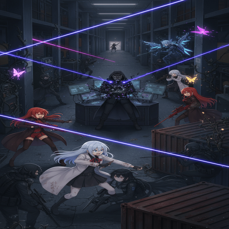 入り組んだ倉庫群の影黒崎夜音と影月闇音は、入り組んだ倉庫群の影に身を潜めていた。夜音は『シャドウリーパー』を構え、周囲の物音に耳を澄ます。闇音は、自身の変身能力『ナイトベール』を低レベルで発動させ、周囲の光と影に溶け込んでいる。「東京湾埠頭…あの組織の実験施設が、この近くにある可能性が高いわ」夜音が低い声で呟く。「白石希も、天海葵も、緋村茜も…奴らは必ずこの戦場に来る。そして、あの組織の狗として、私たちを排除しようとするだろう」闇音は、夜音の背中に手を置き、静かに言った。「夜音。焦らないで。私たちの目的は、あの組織の真実を暴くこと。そして、私たちの故郷を奪った恨みを晴らすこと」その時、夜音の通信機にノイズが走った。「これは…妨害電波か?それとも…」夜音の視線が、埠頭の北西方向、暗闇に紛れて移動する二つの影を捉えた。「緑…緑川葉月と風葉芹歌。やつらも、あの組織の実験対象。だが、私たちの故郷を奪った憎しみを共有する者たち…」夜音の瞳に、複雑な感情が宿る。夜音は、静かに『シャドウリーパー』の照準を『緑』チームへと向けた。『闇夜に消える、死の使者』。彼らは、復讐の刃を研ぎ澄まし、東京湾埠頭の闇で、真実を隠蔽する者たちに迫ろうとしていた。