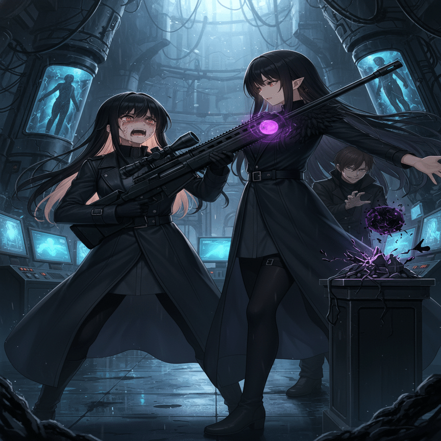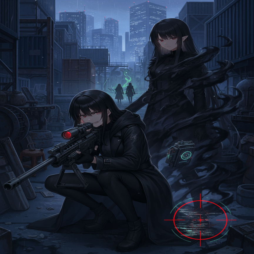 『黒』チーム、黒崎夜音(クロサキ・ヨネ)と影月闇音(カゲツキ・ヤミネ)。「あいつらだけは、許せない」莉々花の白い歯が、夜景の光を反射した。「私たちの故郷を、あの森を壊した黒。姉さん、今度こそ…!」「落ち着きなさい、莉々花」希は静かに制した。「感情は弾道(だんどう)を乱す。私たちの使命は『白銀の裁き』。狙うのは、ただ標的の排除のみ」希は特殊なスコープを覗き込んだ。『シルバーマーク』。彼女の能力により、周囲の微細な熱源、電磁波、音の歪みがデジタル情報となって視界に流れ込む。『ターゲット確認』情報処理された新宿の夜景の、さらにその奥。地上から数百メートルの高さにある、廃墟と化した巨大建設現場のクレーン。その先端に、二つの小さな、しかし決定的な『影』が留まっているのを捉えた。黒崎夜音と影月闇音。「距離、850メートル。風、西北西、秒速3メートル。湿度、45パーセント」希は機械のように情報を読み上げる。「莉々花、あなたは中距離担当。私が仕留め損なったら、『ホワイトノヴァ』で広範囲を制圧しなさい」莉々花は緊張で唾を飲み込んだが、すぐに表情を引き締めた。「了解。ホワイトブレイク、装填完了!」希の指が、引き金に触れる。『純白の裁き、逃れられない』その言葉が、彼女自身の心に楔を打ち込むように響いた。静寂の中、希の呼吸が極限まで細められる。その瞬間、廃墟のクレーンから、一瞬で『影』が消えた。希のスコープが捉えていたクレーンから、まるで空間が歪んだかのように二つの黒い人影が、隣接するビルの影に滑り込む。「『シャドウステップ』…やはり初手から来るわね」希は微動だにしない。「夜音の狡猾な戦術。闇音の『ナイトベール』と組み合わせて、こちらの射程外からの奇襲を狙っている」