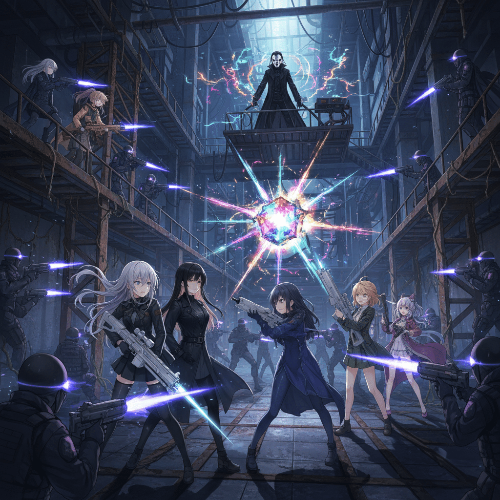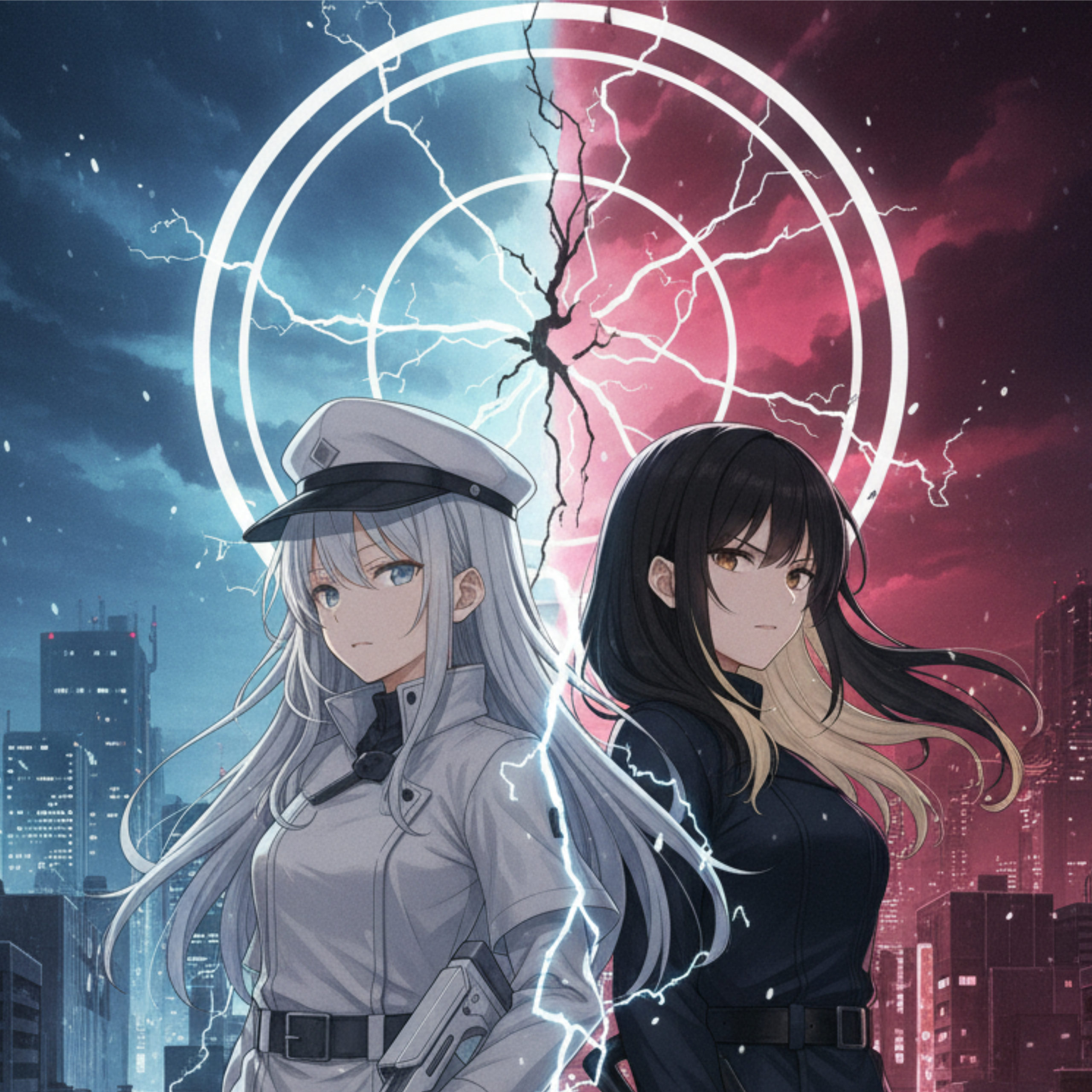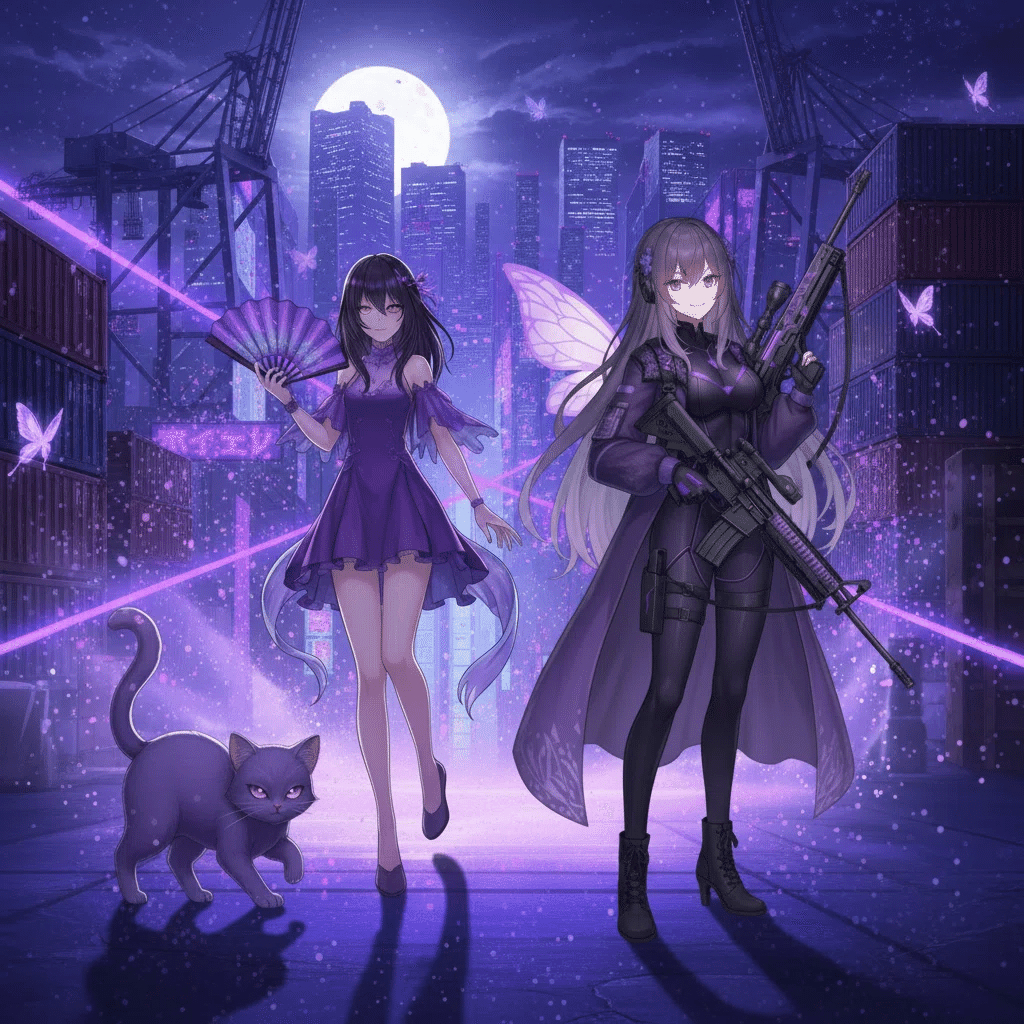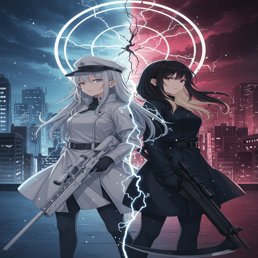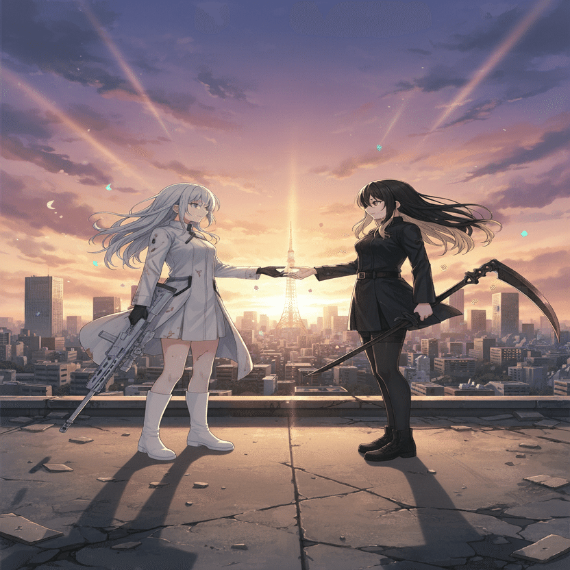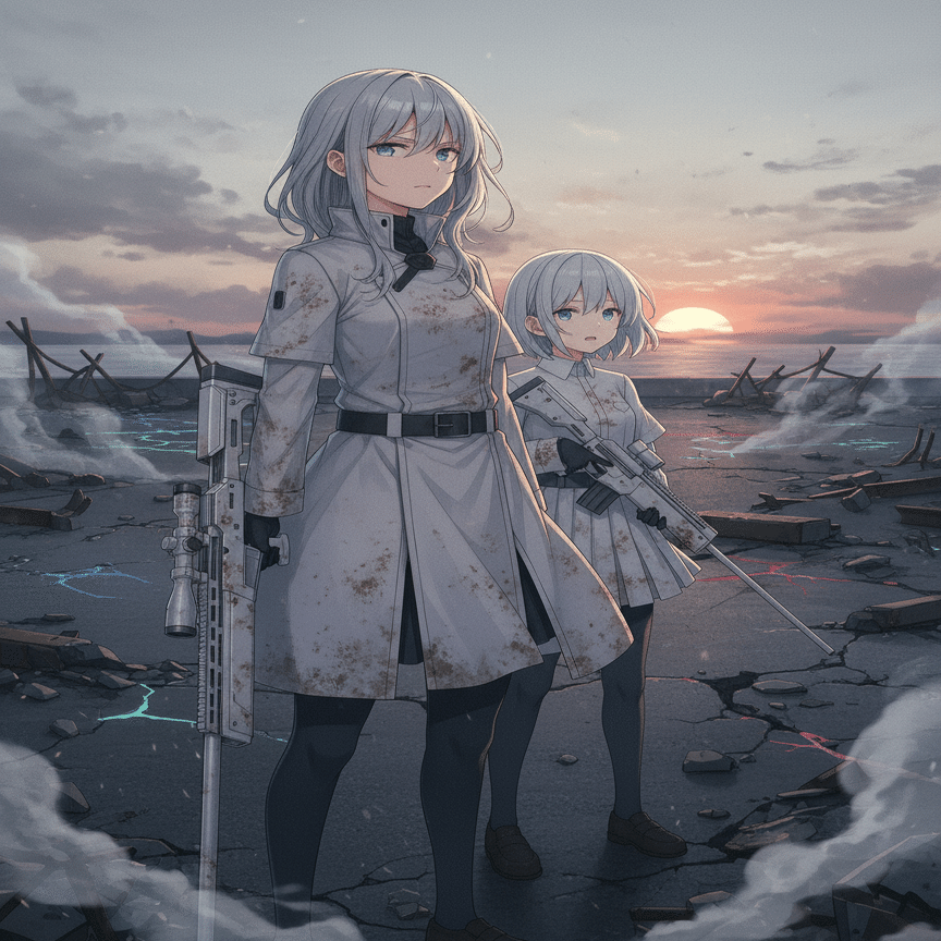 白石希(シライシ・ヒカリ)と妹の白石莉々花(シライシ・ルルカ)その声は、新宿の雑踏から切り離された、冷たい鋼鉄の夜景に響いた。白石希(シライシ・ヒカリ)は、純白のロングコートに身を包み、頭上のキャスケットの影に涼やかな瞳を隠していた。彼女の右手には、全長2メートルを超す対物ライフル『シルバーランス』が、まるで彼女の体の一部であるかのように静かに構えられている。隣には、妹の莉々花(ルルカ)。ショートカットの髪から覗く瞳は、まだ年相応の感情を宿しているが、手に持つ短銃身のスナイパーライフル『ホワイトブレイク』は、彼女がただの少女ではないことを示していた。二人が立つのは、巨大IT企業のビル最上階、ヘリポート。足元には、電子的な光を放つ青い円形のマーカーが、彼女たちの聖域を示している。マーカーの周囲は、都市の喧騒が濾過された、研ぎ澄まされた静寂。「姉さん、もう真夜中だよ。黒崎夜音(クロサキ・ヨネ)たちは本当に来るのかな?」莉々花が、少し苛立ちを抑えきれない声で訊ねた。希は視線を動かさず、夜の帳が降りたビル群の隙間、遥か西側の影を捉えていた。「来るわ、莉々花。彼女たちは『クロスカラーウォーズ』のルールを最も忠実に守る者たち。色の覇権、そして…私たちの因縁を清算するためなら、彼女たちは闇夜を割ってでも現れる」希の言葉には、感情の起伏がなかった。ただ、絶対的な確信と、凍てつくほどの『正義』だけが宿っている。彼女たち白石姉妹のテーマは『純白の裁き』。そして今夜、彼女たちはその『裁き』を下す相手を知っていた。