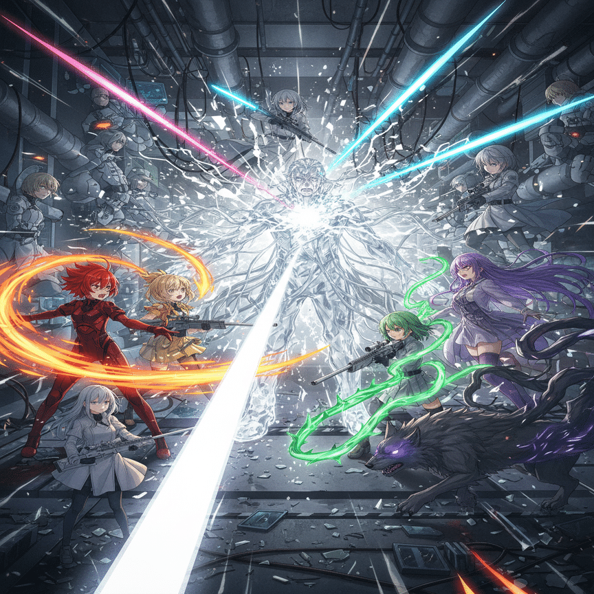 東京の地下深くに広がる極秘研究施設。その最奥部に足を踏み入れた七色の能力者たちの目の前に、Dr.ゼノンは立っていた。彼を覆うのは、無数のケーブルと、あらゆる「色」のエネルギーを無効化する、不気味な「無色のフィールド」だった。