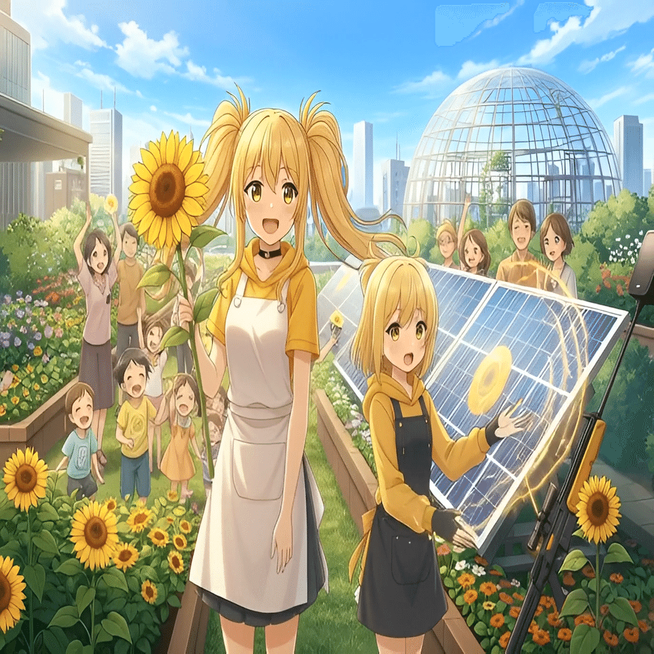黄色チーム: 向日葵ひまわり&柚葵 – 「閃光の如く、標的を捉える」『黄色』チーム。向日葵ひまわり(ヒマワリ・ヒマワリ)と向日葵柚葵(ヒマワリ・ユウキ)。向日葵ひまわりは、太陽のように明るい笑顔を浮かべ、陽気なオーラを放っていた。その手には、まるで太陽の光を凝縮したかのような金色のライフル『サンバースト』が握られている。隣に立つ妹の柚葵は、姉とは対照的に内気な表情を見せていたが、その両腕には鋭い鉤爪『ゴールデンタロン』が装備されており、見る者に確かな殺意を感じさせた。「ひまわり、やりすぎだよ!みんな、びっくりしてるじゃない!」柚葵が小さな声で姉に注意する。「大丈夫だって、柚葵!これが私たち黄色の挨拶だよ!」ひまわりは屈託のない笑顔で応じた。「さあ、みんな!私たちも、この楽しいお祭りに入れてもらうよ!」ひまわりのテーマは『閃光の如く、標的を捉える』。彼女たちは、自らの存在を誇示するように、堂々と戦場に現れた。「黄色…双子の向日葵姉妹か…!」希が呟いた。彼女たちの参入により、戦場は七色全てが揃い、本当の意味でのバトルロイヤルが始まったのだ。「あの自由奔放な黄色か…厄介なのがまた増えた」葵は苦々しい表情を浮かべる。菫は、魅惑的な笑みを深めた。「あらあら、賑やかになってきたじゃない?面白くなりそうね」茜は、ひまわりたちの登場に目を輝かせた。「おいおい、面白ぇ奴らが出てきたじゃねぇか!」夜音は、双子の姉妹の動きを警戒するように、闇音と共に身構えた。葉月は、依然として姿を隠したまま、ひまわりたちの能力を分析しようと試みていた。「莉々花、気を緩めないで。黄色は予測不能な動きをする。特に、あの姉妹の連携は侮れない」希は指示を出す。ひまわりが『サンバースト』を構え、その照準を、戦場の中心で混乱状態にある黒崎夜音と影月闇音へと定めた。「悪いね、黒!お祭りの主役は、私たち黄色だよ!」『サンフラッシュ』!ひまわりの『サンバースト』から放たれたのは、太陽の光を圧縮したかのような、超高速の閃光弾。それは、夜音と闇音の隠れ場所へと一直線に向かっていく。同時に、柚葵が『ゴールデンタロン』を展開し、まるで夜空を滑るように廃墟の建設現場のクレーンを駆け上がっていく。『クローストライク』!柚葵は、鋭い鉤爪でクレーンのワイヤーを切り裂き、その勢いで夜音と闇音の頭上へと飛び降りた。「きゃあああ!?」闇音が驚きの声を上げる。