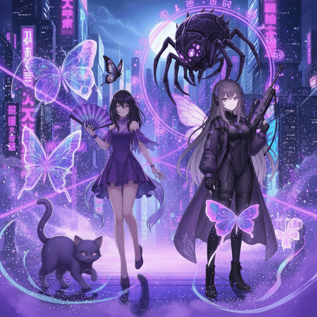 村崎菫(ムラサキ・スミレ)と紫蝶魅音(シチョウ・ミオン)。菫は、魅惑的な笑みを浮かべ、夜の闇に映えるヴァイオレット色のロングコートを翻していた。その手には、幻影を操る特殊なライフル『ヴァイオレットファントム』が握られている。彼女の隣に立つ魅音は、小悪魔のような笑みを浮かべ、身体から毒々しい紫色の光を放っていた。その姿は、時折、蝶や蜘蛛、猫の幻影を伴い、見る者を惑わせる。「やぁねぇ、みんな。ずいぶんとはやってるじゃない」菫の声は、まるで甘い毒のように、戦場全体に響き渡った。「私たちも、混ぜてちょうだい?」『ミラージュオーラ』!菫が能力を発動させると、新宿のビル群のあちらこちらに、彼女たち紫チームの『幻影』が一斉に現れた。それは、残像なのか、本物なのか、誰にも判別できない。「幻影…!?」希は驚きを隠せない。彼女の『シルバーマーク』が、無数の幻影に翻弄され、本物の菫と魅音の位置を特定できない。「おいおい、また新しいのが来たのかよ!」茜が不満げに叫んだ。夜音と闇音も、紫チームの参入に警戒を強める。「紫蝶魅音…変身能力を持つ者…」葵は、傷ついたライフルを構えながら、菫たちを睨みつけた。「一体、どこまで状況を複雑にすれば気が済むの…!」魅音が、いたずらっぽく笑いながら、地面に向けて特殊な糸を放った。『ポイズンウェブ』!