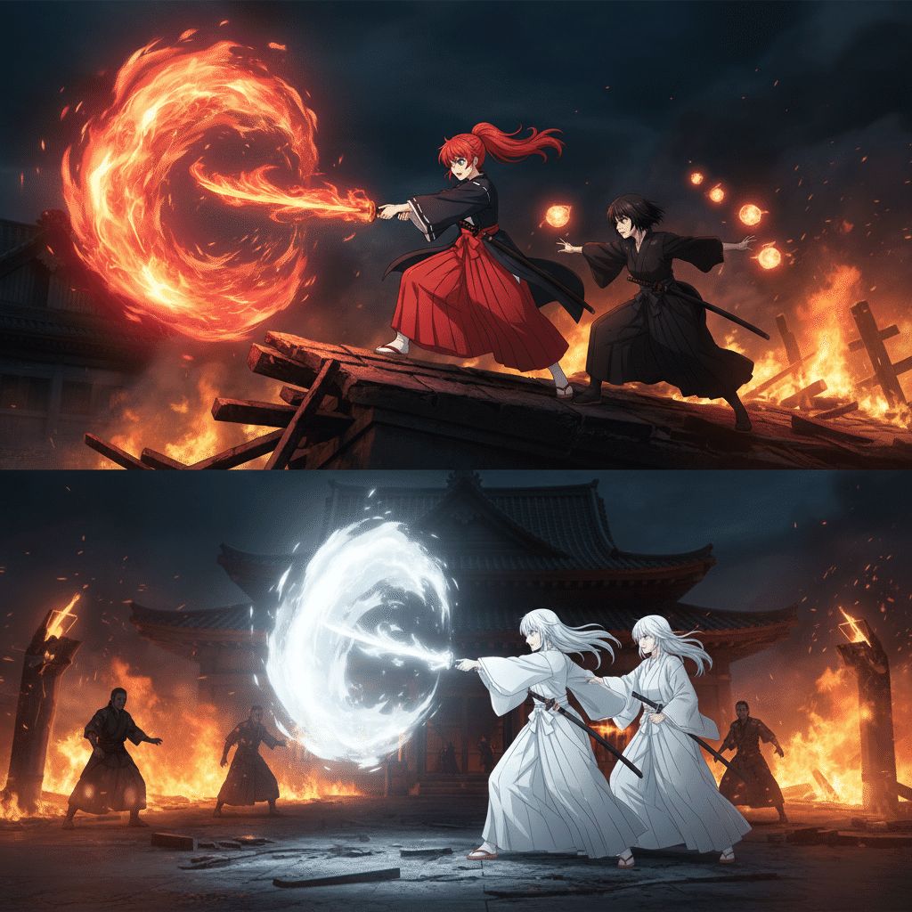対して、姉の耀は十九歳。その姿は、まるで冬の朝、すべてを凍てつかせた後の雪原のように静かで、一切の感情を排していた。彼女の瞳は、霊力の乱れも、建物の崩壊も、貴族たちの悲鳴も、ただの情報として処理する静かな湖のようだ。