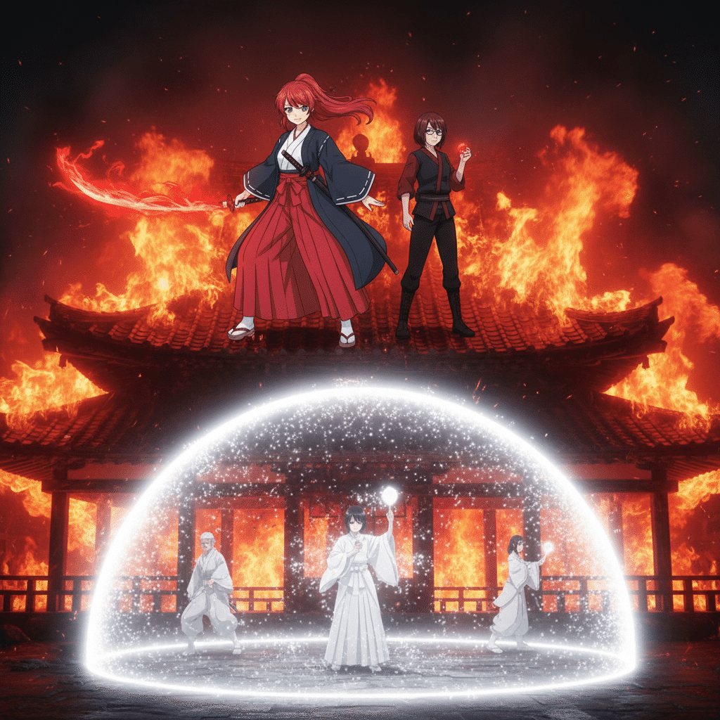 茜は、雪斎の卑劣な行為に激しい怒りを覚え、その情熱的な霊力が、祭壇全体を焼き尽くすほどの炎の結界を瞬時に展開した。