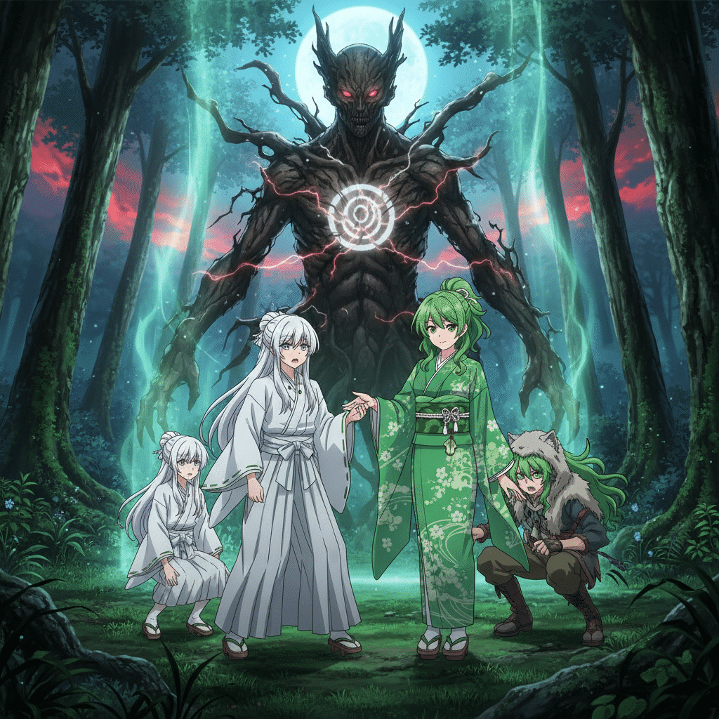 翠葉 葉月(緑)と藤の宮 菫(紫)は、互いの故郷の霊力の残滓を回収し、都の外の森へ、そしてかつての居場所の再興へと向かう。
