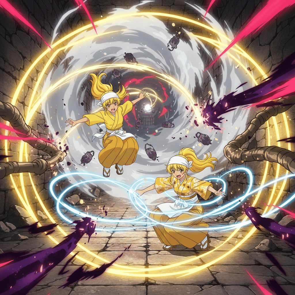 - 黄(向日葵・ゆうき): 光速の呪布と霊力の糸で、夜音の攻撃を超精密に補強し、接合部の破壊を確実にする。