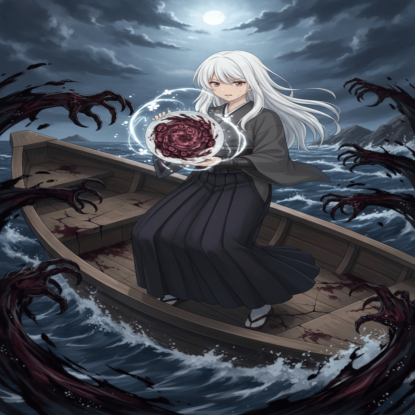 庵を出ると、咲耶は師の手配に従い、夜の森を抜けて海岸へと向かった。霧に包まれた海岸線には、一艘の小さな船が待機していた。都の裏社会に通じた「黒の組」の連絡役、黒崎夜音が手配した船だった。