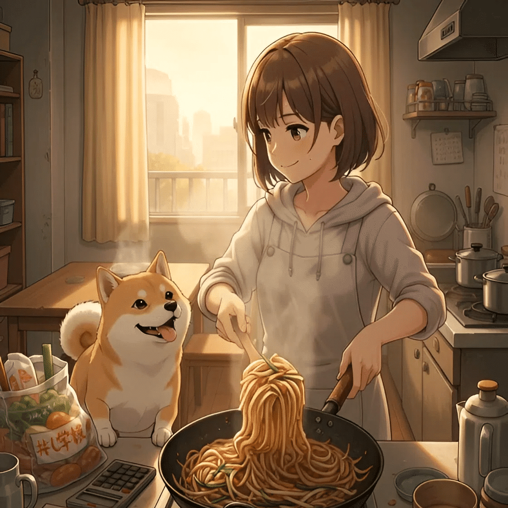 わたしが炒め物を作っている間、マメは足元でじっと待機している。その視線は、熱くて、鋭くて、少しでも手元が狂おうものなら、皿ごと奪いに来るんじゃないかという緊張感がある。