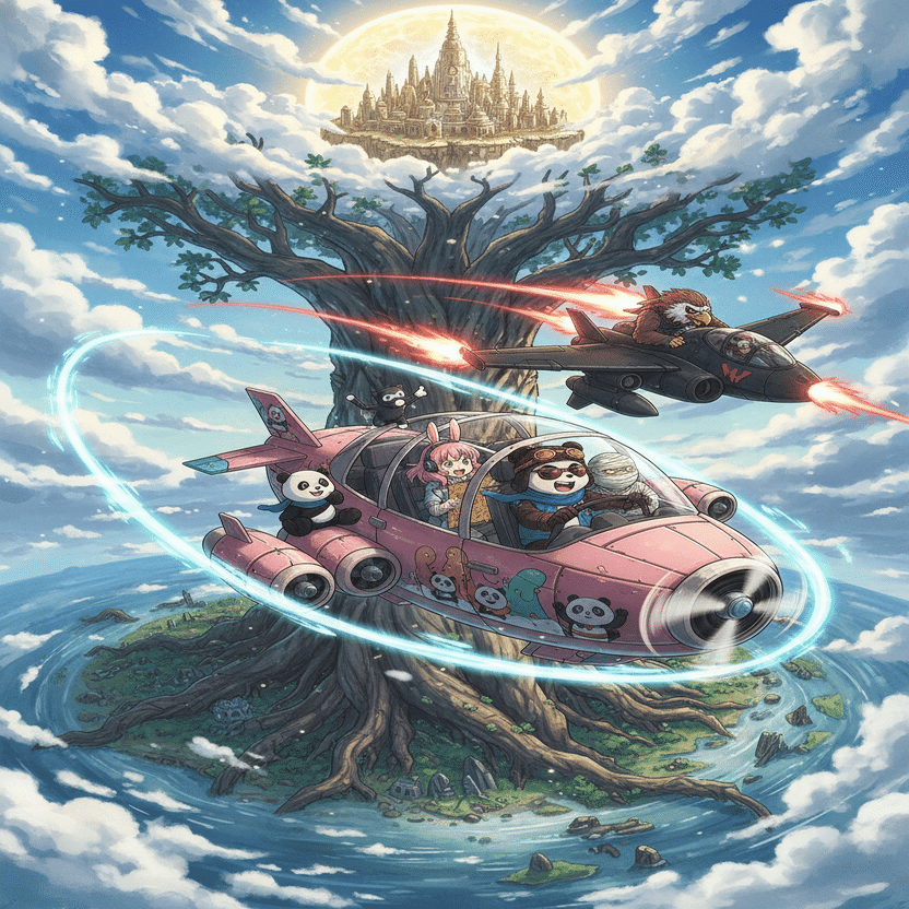 スカイ・パンダ号は、古代の柱状の岩へと突っ込んだ。岩の周囲の強力な磁場が、機体の内部システムと共鳴し、落ちてきた雷のエネルギーを瞬時に吸収した。機体は再び活力を取り戻し、エア・パイレーツ団の追撃を振り切った。