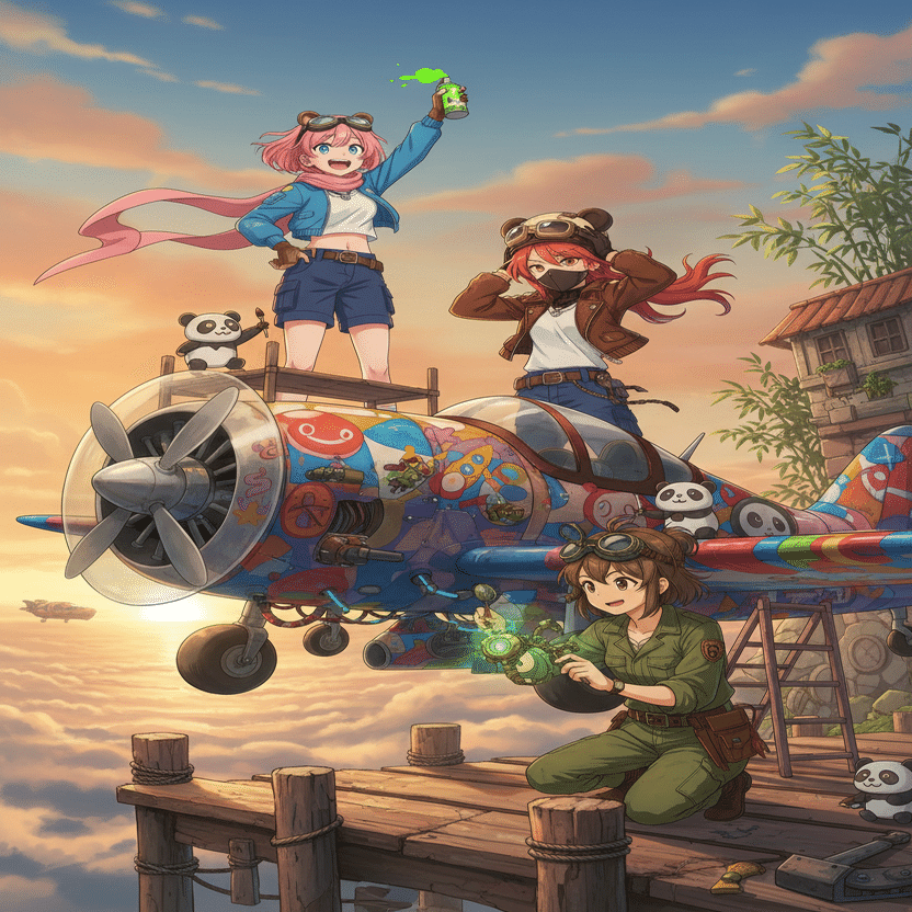 「大丈夫だよ! モモちゃん! 私とミニパンダたちで、もっともっとカッコよく、派手派手にしちゃうから! 正体を隠すなら、地味にするより、目が眩むほど派手なほうがカモフラージュになるでしょ! 誰もこの中身が指名手配犯の遺族だなんて思わないようにね!」 アオイは原色鮮やかな特製ペンキを抱え、ミニパンダたちと機体を自分たちの冒険を描くキャンバスに変えていく。